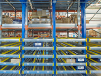 Estas estanterías cuentan con un sistema de rodillos. Facilitan el desplazamiento de palets por gravedad, permitiendo que los productos se desplacen automáticamente desde el área de carga hasta la de descarga. Son ideales para operaciones de alta rotación y sistemas FIFO (primero en entrar, primero en salir), especialmente en la industria alimentaria y en la gestión de productos perecederos.
